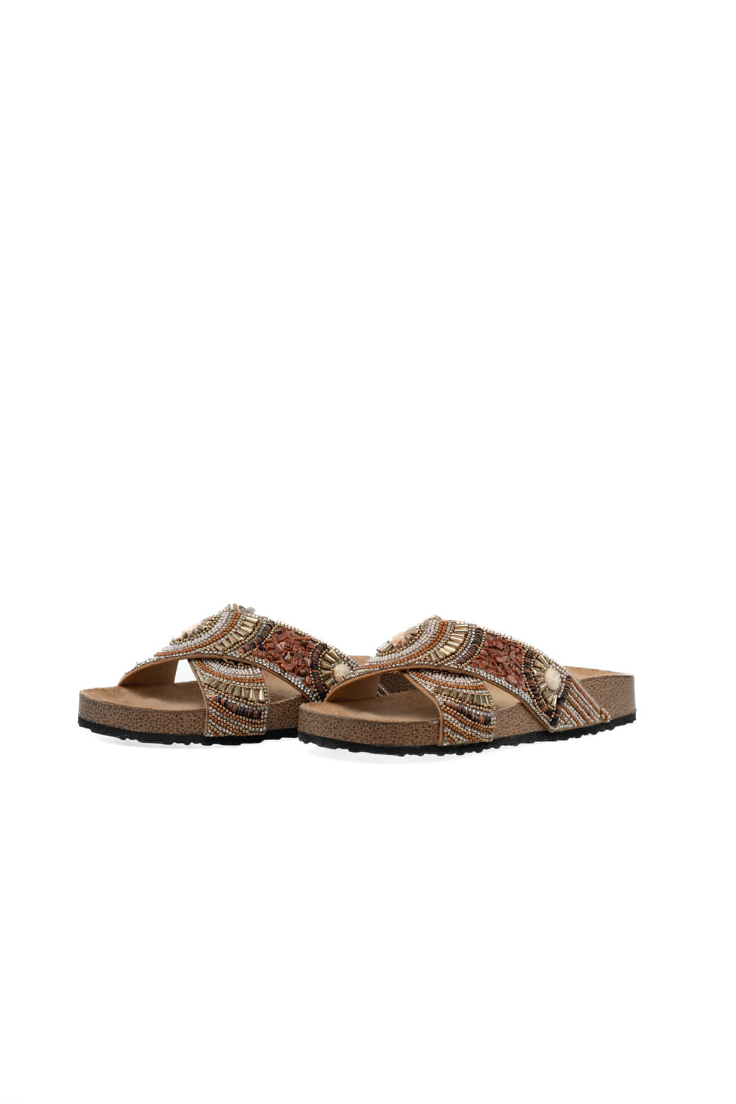 Zueco base birk con 2 fajas cruzadas y detalle de canutillos bordados, la comodidad de su diseño y sus detalles lo convierten en tu mejor aliado para esta temporada.