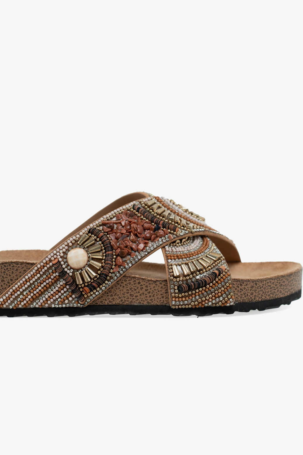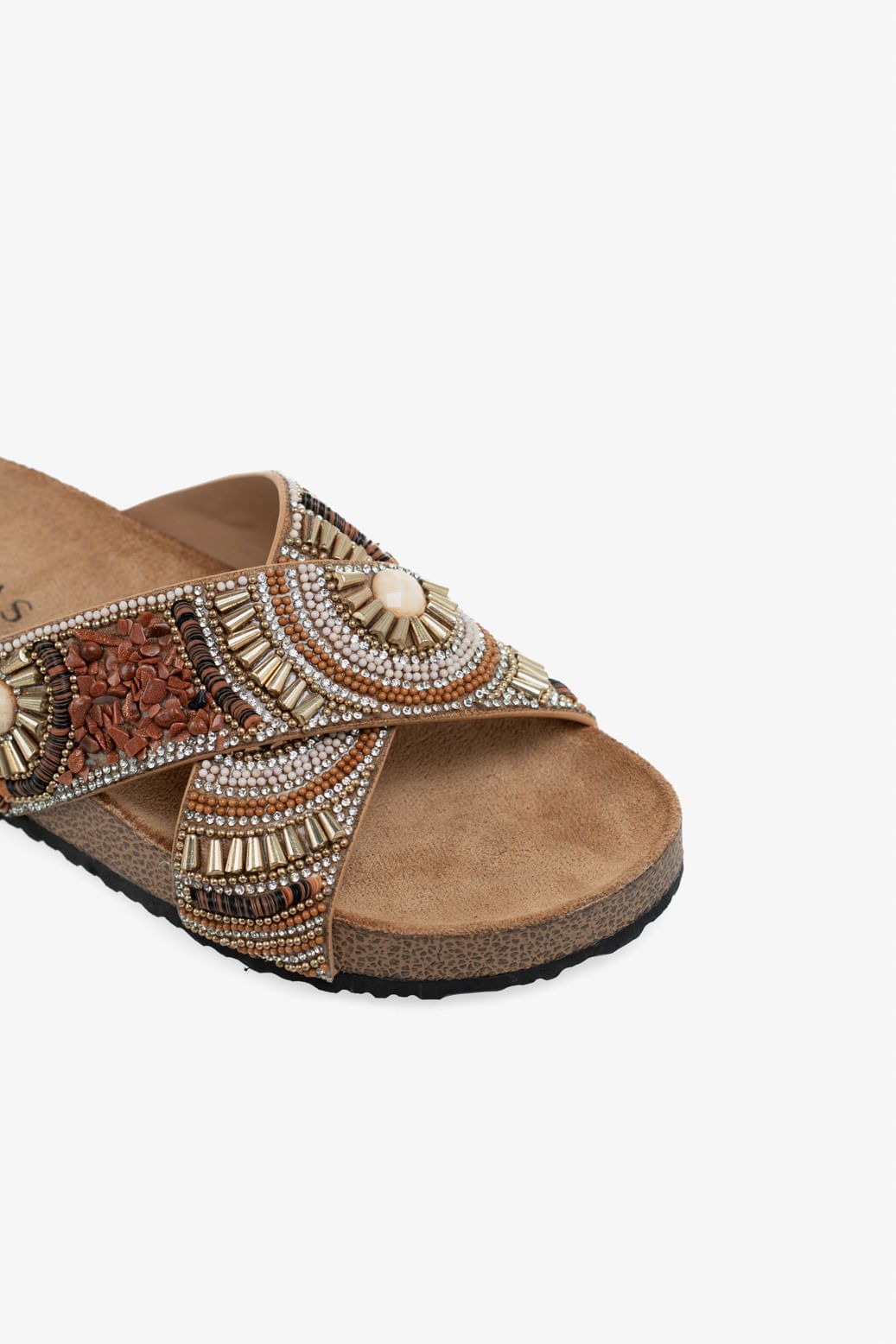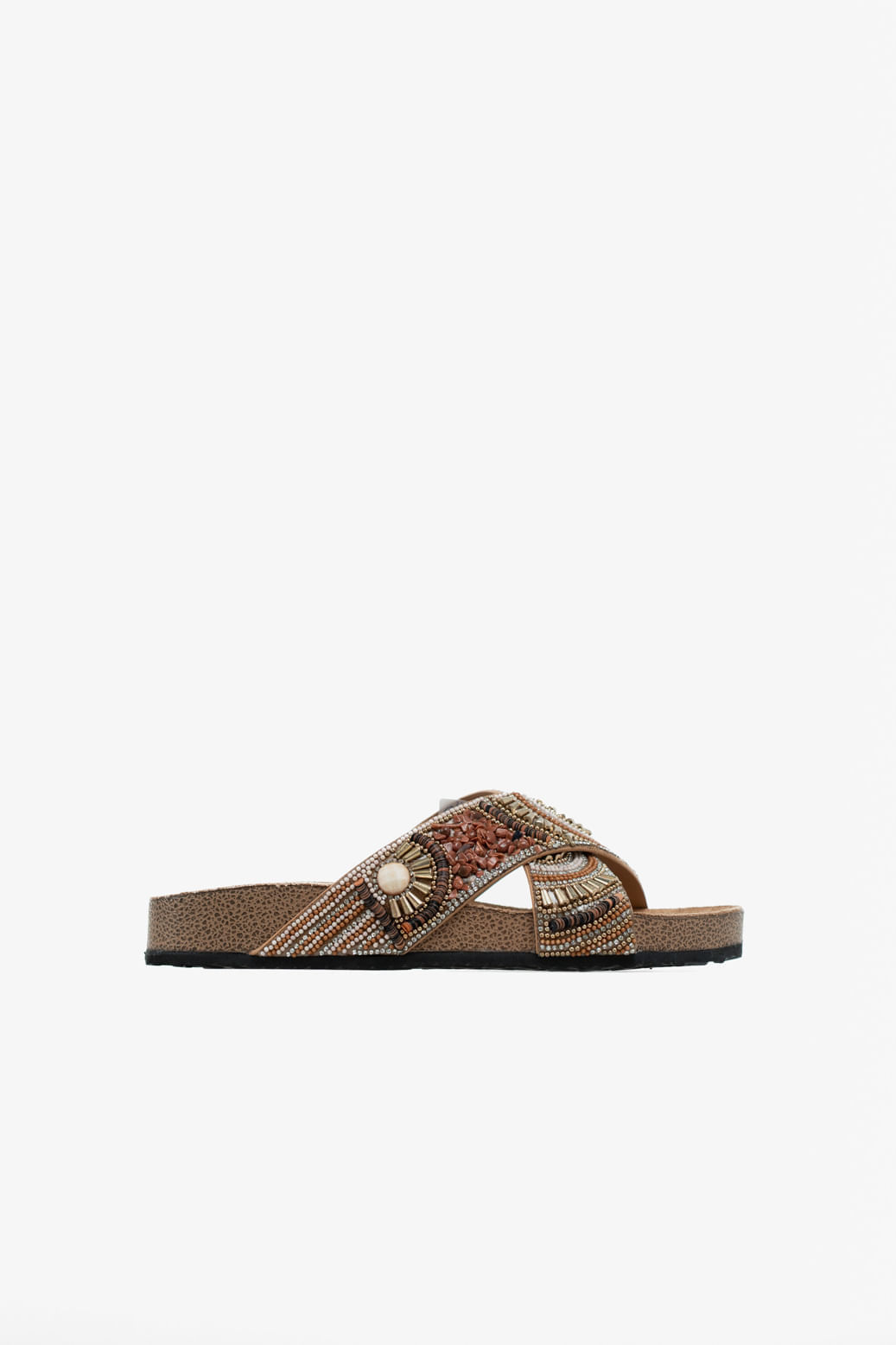 Zueco base birk con 2 fajas cruzadas y detalle de canutillos bordados, la comodidad de su diseño y sus detalles lo convierten en tu mejor aliado para esta temporada.