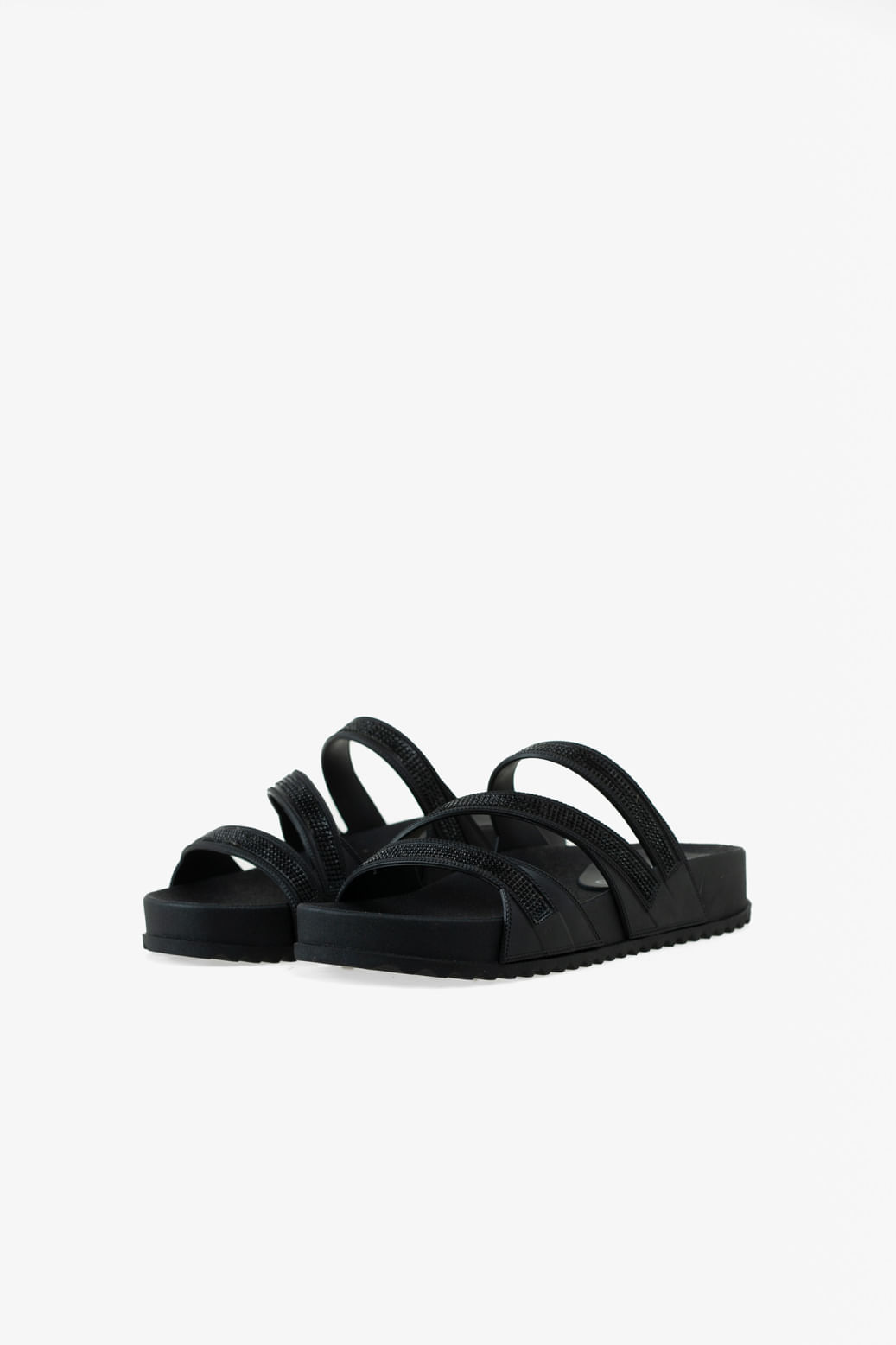 Zueco base birk de goma y tiras con brillo que suma comodidad y estética a tu look.